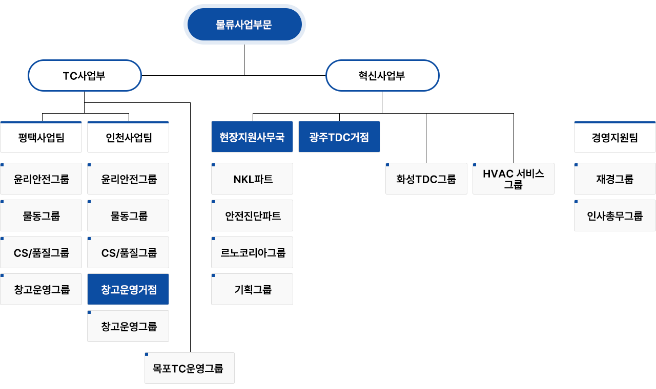 - 주요사업 : Video Display 입출고 관리, 창고운영, 창고간 수송 및 르노코리아자동차㈜ 서비스부품 수배송 및 입출하 업무, 시스템에어컨 유지보수/감리, 회사 전반의 산업안전 업무, 회사 전반의 기획그룹 업무, 현장지원사무 업무